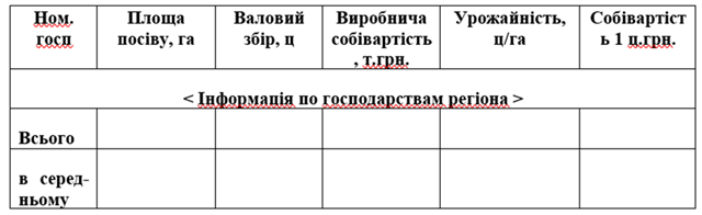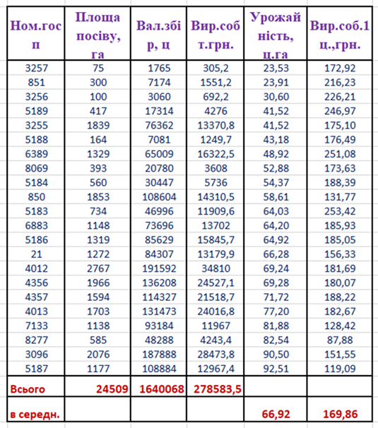 Як свідчать дані таблиці 2 урожайність зернових та зернобобових культур в 2015 р. в господарствах Яготинського району Київської області склала від 23.53 до 92.51 ц, в середньому по району 66.92 ц, суттєво відрізняється по господарствам і виробнича собівартість 1 ц в гривнях. Цей вид таблиць дозволяє визначити існуючий стан виробництва або вирощування певних видів продукції, порівнювати між собою результати окремих господарств, виявляти причини кращих або гірших результатів та робити відповідні висновки.
