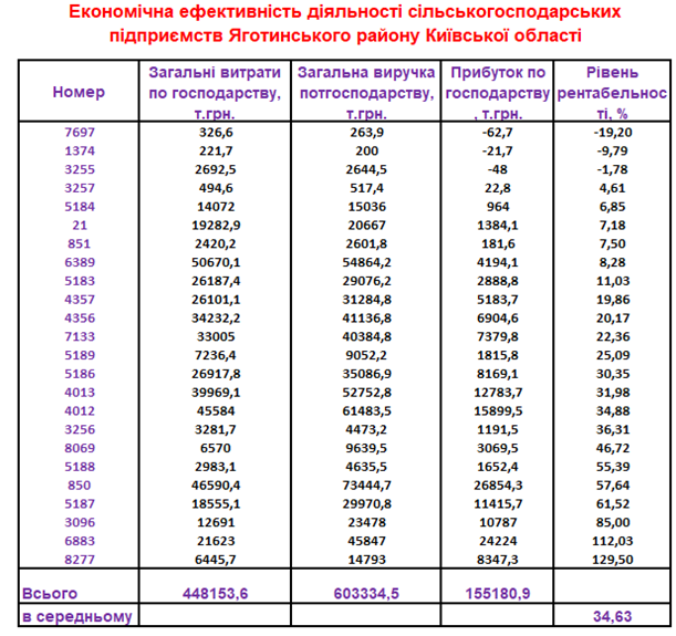 Таблиця 7. Економічна ефективність виробничої діяльності господарств Яготинського району Київської області.