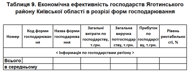 Завдання 2. Визначити економічну ефективність діяльності сільськогосподарських підприємств Яготинського району Київської області в розрізі організаційно-правових форм господарювання. Результати подати у вигляді таблиці 9.