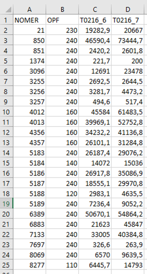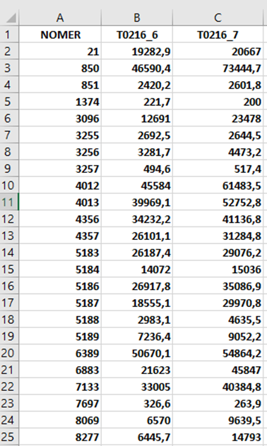 Рис.19. Відібрані показники з файлу Т2_15 для виконання завдання 2.