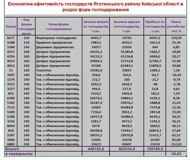 Таблиця 10. Економічна ефективність виробничої діяльності господарств Яготинського району Київської області в розрізі організаційно-правової форми господарювання: