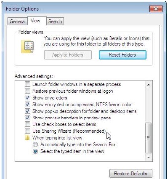 1. Почніть сеанс роботи на комп’ютері з встановленим принтером та перейдіть по пунктах Start >Computer > Tools > Folder options > View (Пуск>Комп'ютер> Властивості> Параметри папок >Вид), та відключіть параметр Use Sharing Wizard (Recommended) (Використовувати майстер спільного доступу), якщо він натиснений.