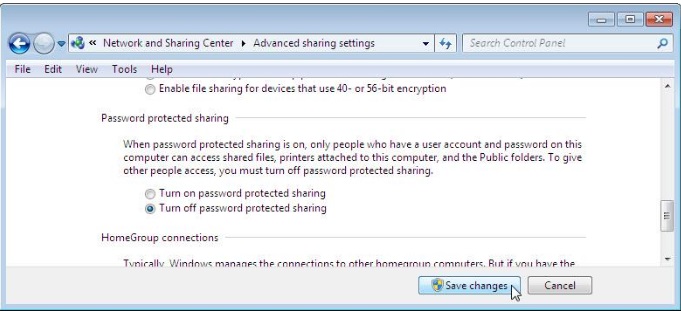 2.Натисніть Start > Control Panel > Network and Sharing Center> (Пуск> Панель керування >Центр керування мережами і загальним доступом >) оберітьChose homegroup and sharing options > Change advanced sharing settings (Вибір домашньої групи і параметрів загального доступу > Змінити додаткові параметри спільного доступу).