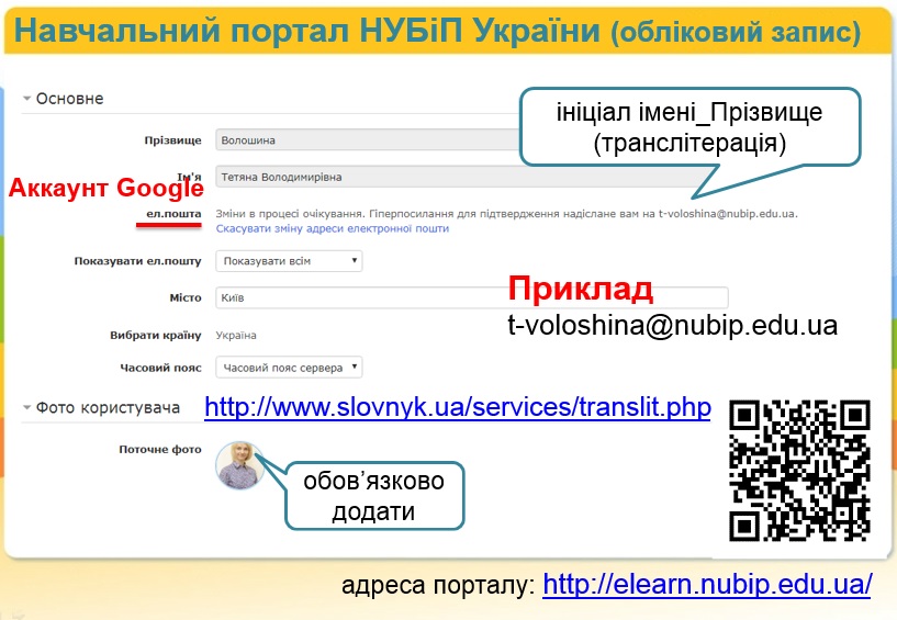 2. Заповніть ваш профіль (Про користувача) на відповідному порталі, а саме додайте своє особисте фото, вкажіть електронну пошту на gmail.com (вам мають надати корпоративні аккаунти в домені *.nubip.edu.ua), та ваші інтереси.