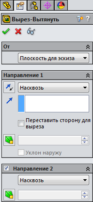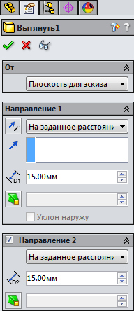 .Для подальшого зручності, видавіть в обидві сторони від площини ескізу, на панелі властивостей, задайте величину видавлювання по 15 мм.