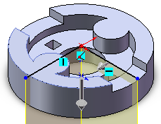 Виберіть торцеву площину більшого циліндра в якості площині побудови ескізу. Створіть ескіз згідно рисунку. Побудуйте вертикальну вісь. Виберіть команду Багатокутник з кількістю вершин рівним 3 і діаметром вписаного кола 0,95.