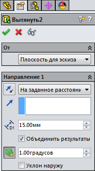 Застосуйте до ескізу команду Витягнута бобишка, встановіть відстань - 15 мм і кут нахилу 1 °.