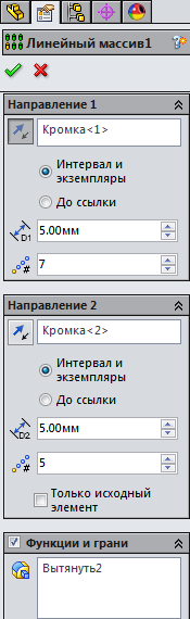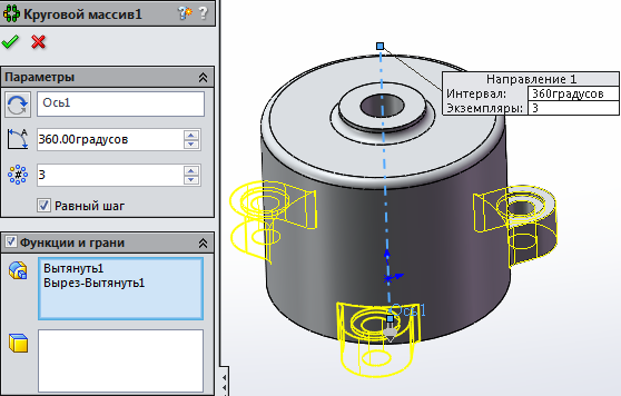 , Вказавши в розділі Параметри - побудовану вісь, а в розділі Функції та межі - вирізане поглиблення (Виріз-Витянуть1).