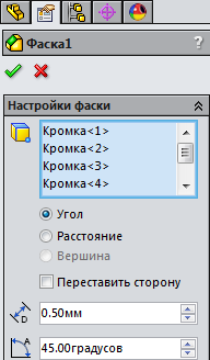 , Відзначте всі шість ребер отворів, встановіть параметри катета 0,5 мм і кут нахилу 45 °.