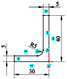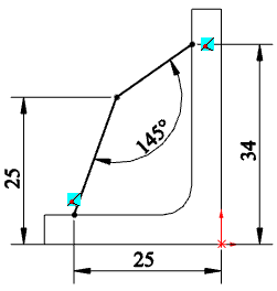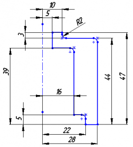 Для моделювання ребра жорсткості виберіть бічну торцеву площину куточка в якості площині побудови ескізу. Побудуйте ескіз згідно з малюнком.
