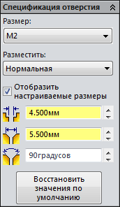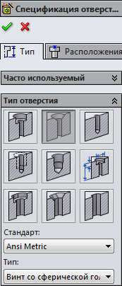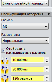 .На панелі, що з'явилася властивостей виберіть отвір з фаскою і задайте параметри, представлені на малюнку.