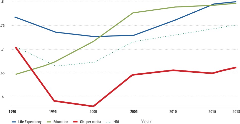 Рис. 2.3. Тенденції складових індексу ІЛР України за 1990-2018 роки.