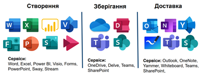 - комунікація (Outlook, Календар, Delve, корпоративна соціальна мережа Yammer, Planner, To-do);