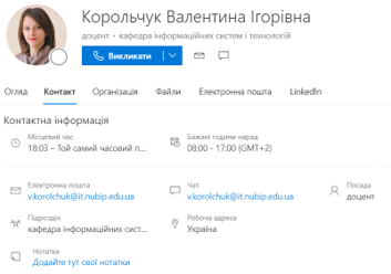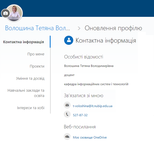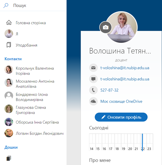 Кожен працівник компанії (установи) має власну сторінку профілю в сервісі Delve. Саме такі сторінки можуть використовувати для пошуку інформації про користувачів в межах організації, налагоджувати комунікацію між користувачами безпосередньо зі сторінки профілю в Delve. На власній сторінці кожен користувач може швидко знайти та розпочати роботу з необхідним документом, здійснити переходи на сторінки інших користувачів, щоб дізнатися необхідну доступну інформацію, а також оновлювати особисті дані для більш ефективної взаємодії та співпраці в межах компанії. Щоб перейти на сторінку профілю, в області ліворуч необхідно натиснути Я або своє ім’я чи зображення будь-де в Delve.