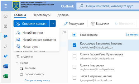 Для створення нового контакту необхідно обрати вкладку Головна – Створити контакт (рис. 6.70). Користувач може створити: Новий контакт (натиснути комбінацію Shift+N), Новий список контактів (натиснути комбінацію Shift+L) або Нова група.