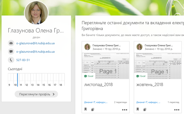 На головній сторінці кожного профілю відображаються останні документи та вкладення електронної пошти, які зберігаються у файловому сховищі OneDrive або бібліотеці SharePoint.
