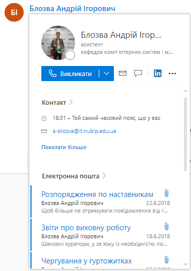 Докладні відомості про контакти в разі наведення вказівника миші на його ім'я.