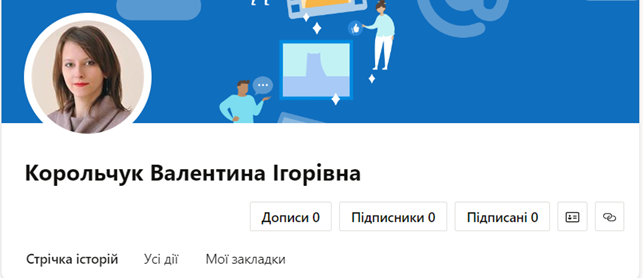 У кожного користувача Microsoft365 є особиста сторінка, на якій користувач може перглядати стрічку історій, усі дії або ж власні закладки.