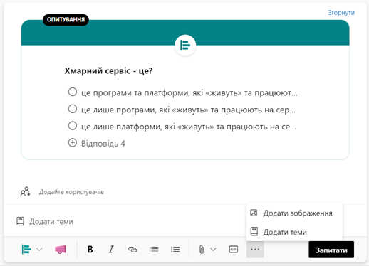 Для проведення опитування користувачів спільноти, необхідно обрати відповідний тип допису, додати запитання та необхідну кількість варіантів відповідей. Також за необхідності можливо додати користувачів до даного допису, вказати тему чи прикріпити додаткові елементи (файл, зображення тощо). По завершенню усіх налаштувань, для публікації такого типу допису необхідно натиснути Запитати.
