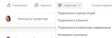 Переглядаючи дописи інших користувачів, користувачам доступна можливість взаємодії з ними: встановити відмітку Подобається, додати Примітку чи поділитися даним дописом в стрічці історій, спільноті, особистому повідомлення, або ж скопіювати посилання на даний допис.