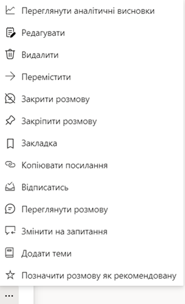 Для роботи з уже розміщеним дописом, користувачу необхідно натиснути та в діалоговому вікні обрати необхідну дію. Таким чином доступне редагування, видалення, переміщення допису, додавання теми, зміна типу допису, закріплення допису, закриття чи закріплення розмови, відмічання розмови як рекомендованої, а також перегляд аналітичних висновків взаємодії із даним дописом. Такі аналітичні висновки міститимуть інформацію про кількість переглядів, залучення користувачів (залишенні реакції, коментарі чи поширення), а також тенденції розмови за обраний період: 7, 14 чи 28 днів.