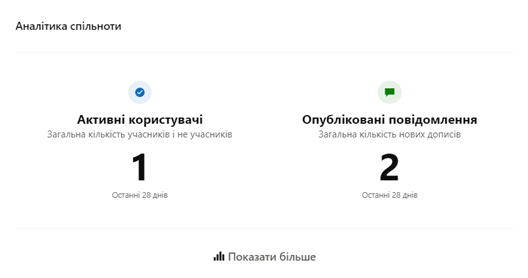 На вкладці Про програму, доступна аналітика використання даної спільноти усіма користувачами, інформація про учасників, відомості про спільноту, а також пов’язані спільноти. Аналітика спільноти міститиме інформацію про активних користувачів та кількість опублікованих повідомлень за останні 28 днів.