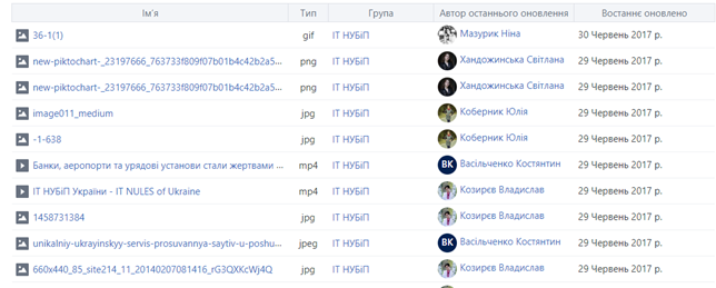 При створенні кожної спільноти, автоматично створюється сховище файлів такої спільноти, за допомогою якого користувачі можуть обмінюватись або поширювати файли. Для переходу у сховище необхідно натиснути Файли, де будуть доступні всі файли, якими поділились користувачі даної спільноти. Користувачі матимуть змогу переглянути сам файл, а також основну інформацію про нього, таку як: ім’я, тип файлу, спільнота (група), автор та дата останнього оновлення.