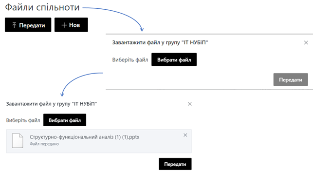 Для розміщення нових файлів необхідно у файлах спільноти натиснути Передати, на наступному кроці Вибрати файл та у діалоговому вікні обрати файл для завантаження, після завантаження файлу натиснути Передати.