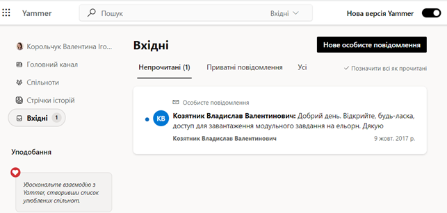 Також у соціальній спільноті Yammer, користувачі мають змогу обмінюватись приватними повідомленнями, які відображатимуться у вкладці Вхідні.