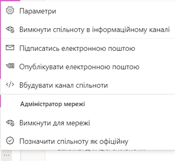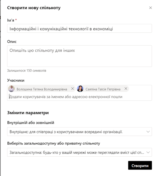 Для створення спільноти користувачу необхідно обрати Спільноти та Створити спільноту. У вікні Створення нової спільноти необхідно присвоїти ім’я, долучити учасників (за іменем або корпоративною електронною адресою), за необхідності додати опис та налаштувати параметри спільноти. Така спільнота можлива як внутрішня, лише для користувачів Вашої організації, так і зовнішня, призначена для співпраці з користувачами поза межами однієї організації. Також при створені спільноти можливо налаштувати її приватність. У випадку створення загальнодоступної спільноти, розміщений вміст зможуть переглядати всі учасники Вашої організації.