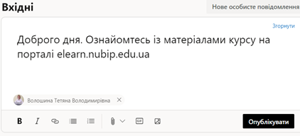 Для написання нового повідомлення необхідно натиснути Нове особисте повідомлення та у вікні повідомлення додати текст, додаткові елементи для надсилання (файли, зображення, gif-файли, посилання), а також натиснувши Додати користувачів обрати адресатів даного повідомлення. Для відправки готового повідомлення, необхідно натиснути Опублікувати.