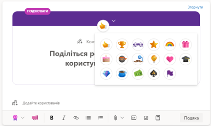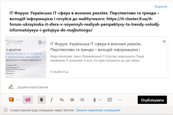 Публікуючи оголошення, необхідно обрати тип допису Обговорення. До такого допису за необхідності користувач має можливість додати текст, файли, посилання, gif-файли, зображення, тему допису, згадати користувачів, а також за необхідності налаштувати форматування та параметри оповіщення.