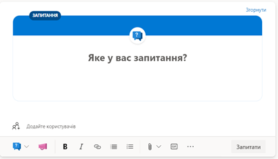 Для публікації типу допису Запитання, необхідно обрати його тип одразу при публікації або ж змінити після розміщення, додати запитання, за необхідності користувачів та додаткові матеріали чи ілюстрації та натиснути Запитати.