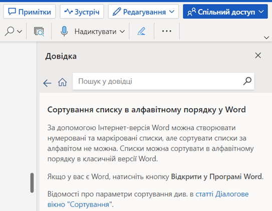 Працюючи в онлайн версії Word користувач може надати спільний доступ до створеного документи (Файл – Спільний доступ), поділитись з іншими, тобто запросити колег до перегляду або редагування. Вибравши Файл – Спільний доступ – Вбудування автор чи співавтор може отримати код для вбудовування даного документу в вебсайт, блог чи інший зовнішній ресурс.