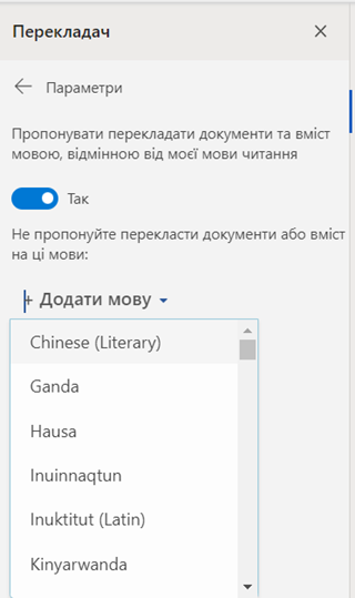 Далі користувач має можливість обрати мову розшифровки з наявних підтримуючих мов корпорації Microsoft, що будуть використані в відео.