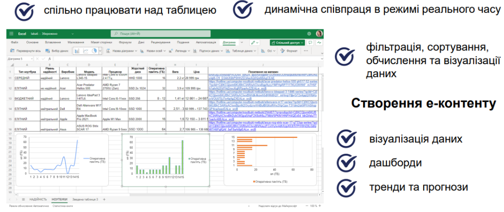 Завдяки сервісу OneDrive є можливість виконувати спільні завдання та інше використовуючи можливість створення документу Word, книги Excel, презентації PowerPoint, блокноту OneNote, Forms для Excel, креслення Visio або посилання для ефективної взаємодії при веденні економічної та фінансової діяльності.