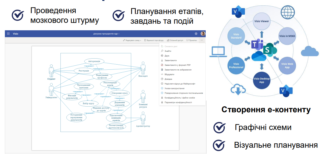 Експорт дозволяє перетворити документ на інтерактивну вебсторінку, якою швидко можна поділитись та адаптована для перегляду на різних пристроях. Також користувач має можливість роздрукувати документ натиснувши Друк (Файл – Друк).