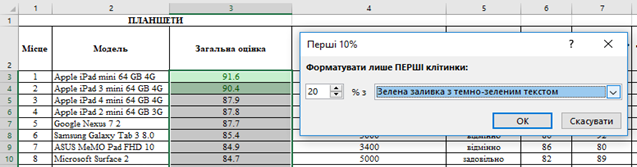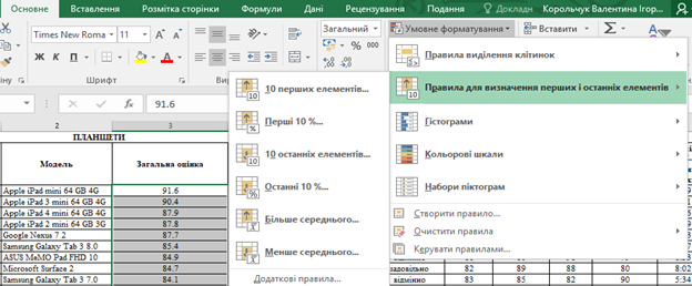 Для цього необхідно виділити один або декілька діапазонів клітинок. На вкладці Основне обрати Умовне форматування, а потім – елемент Правила для визначення перших і останніх елементів. Наступник кроком потрібно обрати одне із запропонованих правил. Наприклад Перші 10 елементів, Останні 10% або елементи, що менше середнього значення.