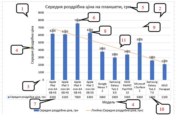 ‒ Графік – відображає тенденції або прогрес та використовується для візуалізації різноманітних категорій даних. Її слід застосовувати при необхідності представити діаграму засновану на тривалому зборі даних.