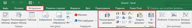 Процес побудови різних видів діаграм практично не відрізняються, лише необхідно обрати відповідний тип візуалізації. Перед початком побудови діаграми, необхідно створити таблицю з даними, які в подальшому необхідно візуалізувати. Виділивши дані, необхідно перейти на вкладку «Вставлення» панелі інструментів, та в групі Діаграми обрати необхідний тип діаграми.