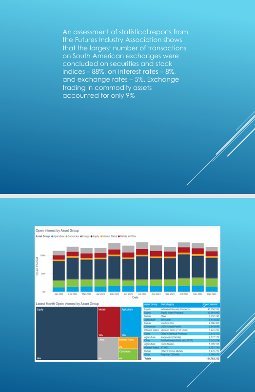 An assessment of statistical reports from the Futures Industry Association shows that the largest number of transactions on South American exchanges were concluded on securities and stock indices – 88%, on interest rates – 8%, and exchange rates – 5%. Exchange trading in commodity assets accounted for only 9%.