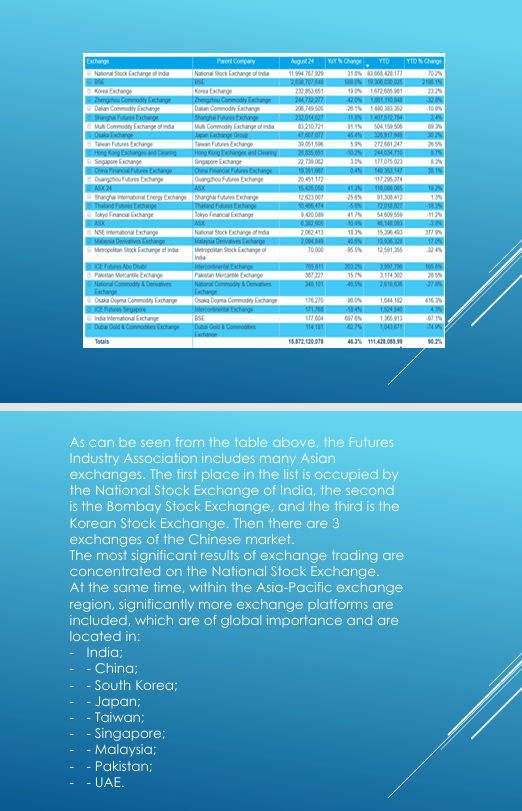 As can be seen from the table above, the Futures Industry Association includes many Asian exchanges. The first place in the list is occupied by the National Stock Exchange of India, the second is the Bombay Stock Exchange, and the third is the Korean Stock Exchange. Then there are 3 exchanges of the Chinese market [16].