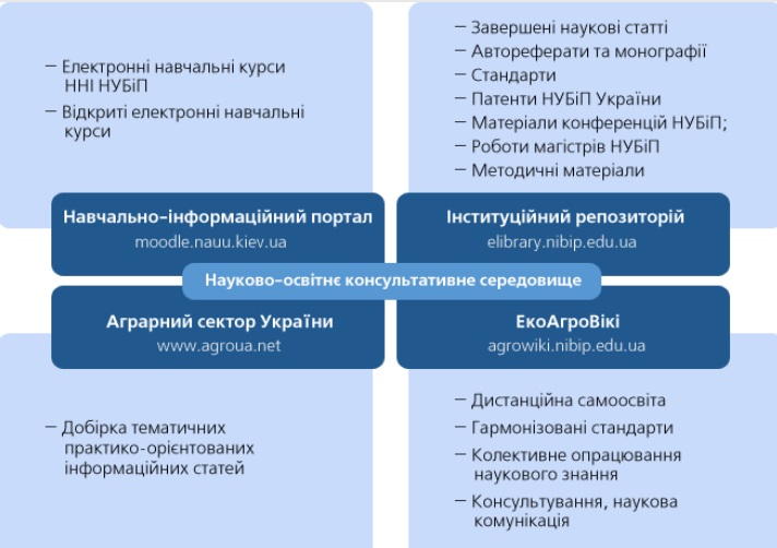 - Консолідація інформаційно-освітніх ресурсів, активне залучення науково-педагогічних працівників, аспірантів та студентів НУБіП України до створення та гармонізації наукового знання засобами інформаційно-комунікаційних технологій;