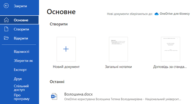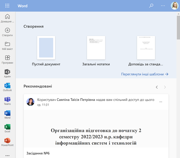 Сервіс Word допомагає створювати документи професійної якості. Вона дає можливість ефективніше створювати та впорядковувати документи. Для початку роботи з таким типом документів необхідно відкрити Microsoft 365 та відповідно обрати сервіс Word. На головній сторінці сервісу користувачу пропонуються варіанти створення нового документу: Пустий документ або вибір із пропонованих шаблонів.