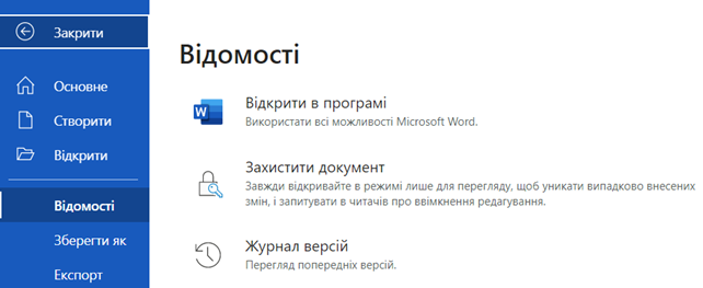 У вкладці Відомості користувач може Відкрити в програмі (використати всі можливості Microsoft Word), Захистити документ, тобто завжди відкривати в режимі лише для перегляду, щоб уникати випадково внесених змін і запитувати в читачів про ввімкнення редагування або Журнал версій для перегляду попередніх версій.