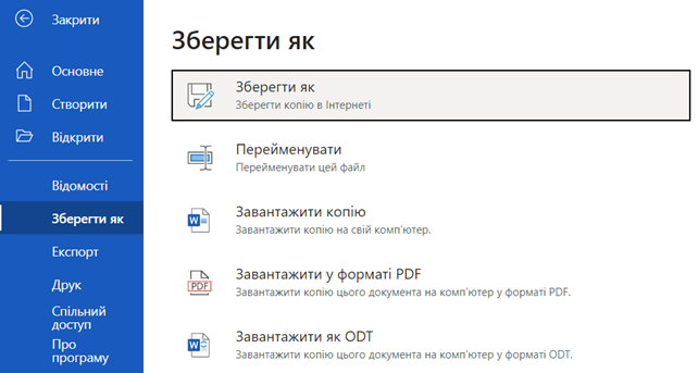 Для збереження документу користувач натискає Файл – Зберегти як та відповідно вибирає необхідний варіант (Зберегти як копію в Інтернеті, Перейменувати цей файл, Завантажити копію на свій пристрій, Завантажити копію у форматі .pdf на власний пристрій, Завантажити як ODT формат на власний пристрій).