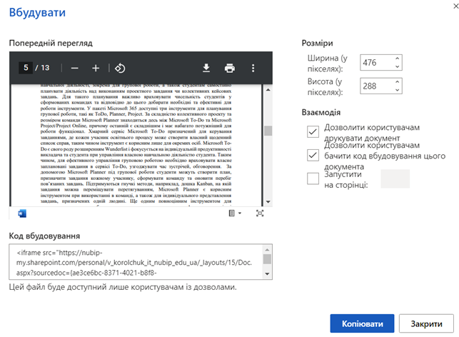 Працюючи в онлайн версії Word користувач може надати спільний доступ до створеного документи (Файл – Спільний доступ), поділитись з іншими, тобто запросити колег до перегляду або редагування. Вибравши Файл – Спільний доступ – Вбудування автор чи співавтор може отримати код для вбудовування даного документу в вебсайт, блог чи інший зовнішній ресурс.