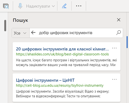 В текстовому редакторі доступна функція на вкладці Основне – Повторно використати файли. Користувачу відкривається доступне вікно Пошук, в полі вводимо ключовий запит та відповідно натискаємо Enter. Пошук може здійснюватись за такими критеріями: Усе, Інтернет, Медіафайли, Довідка, Нотатки, Файли, Цей файл.