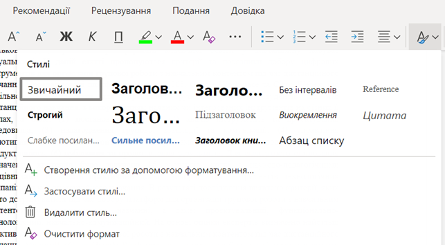 Користувач може застосувати вибраний стиль, видалити або очистити формат. За потребою користувач може створити стиль за допомогою форматування.