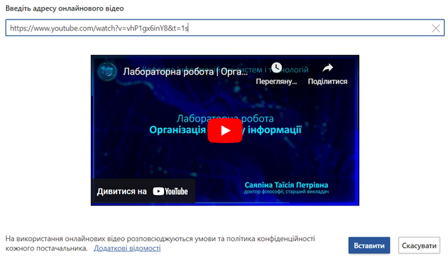 Також доступна можливість вставити відеоконтент, для цього потрібно обрати Вставлення – Онлайнове відео та ввести адресу онлайнового відео. Якщо адреса правильна, то попередній перегляд відео відобразиться в відповідному вікні. Підтримувані постачальники відео в текстовому редакторі Word є: YouTube, SlideShare, Vimeo, Stream, Flip, TED.